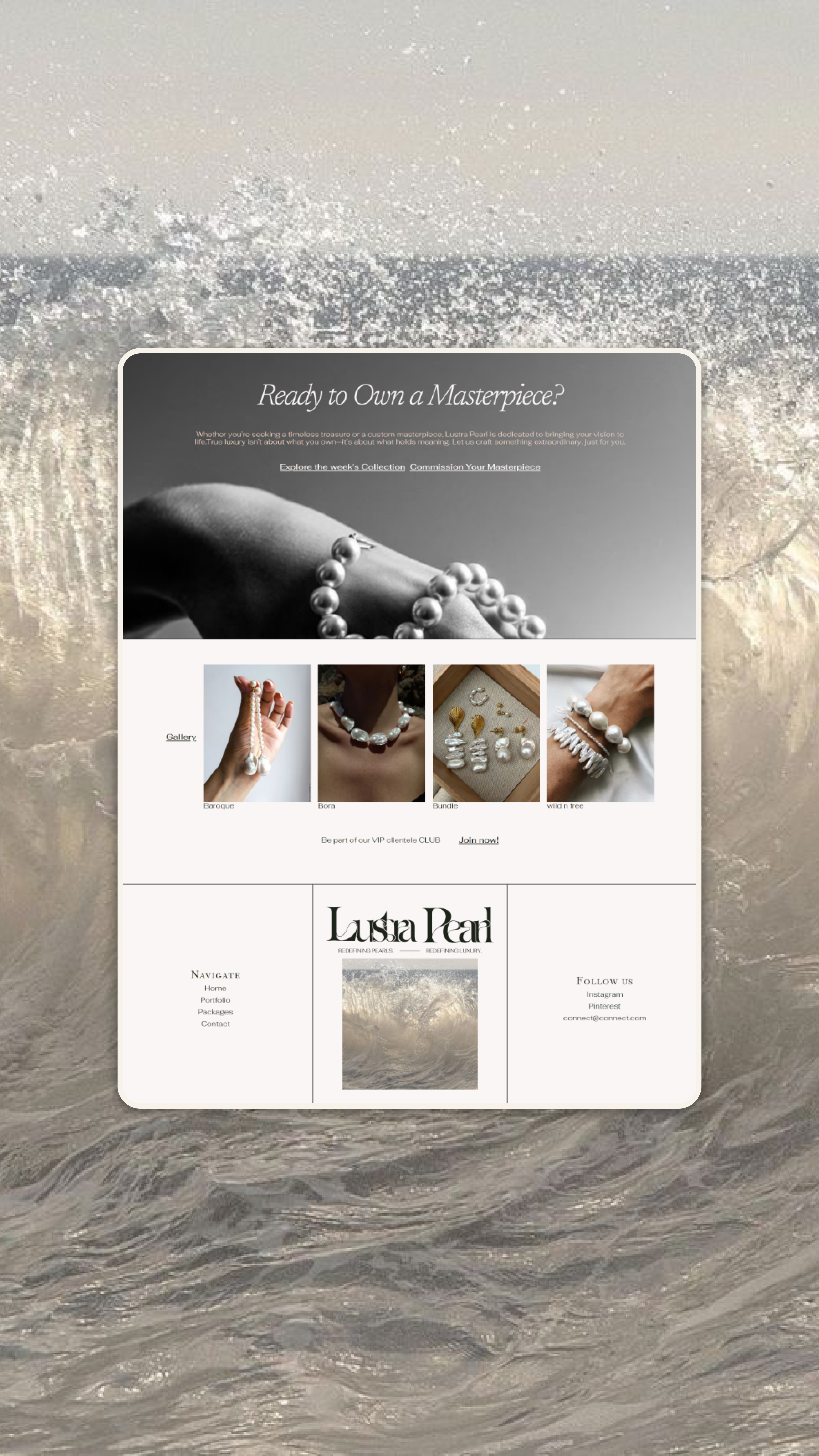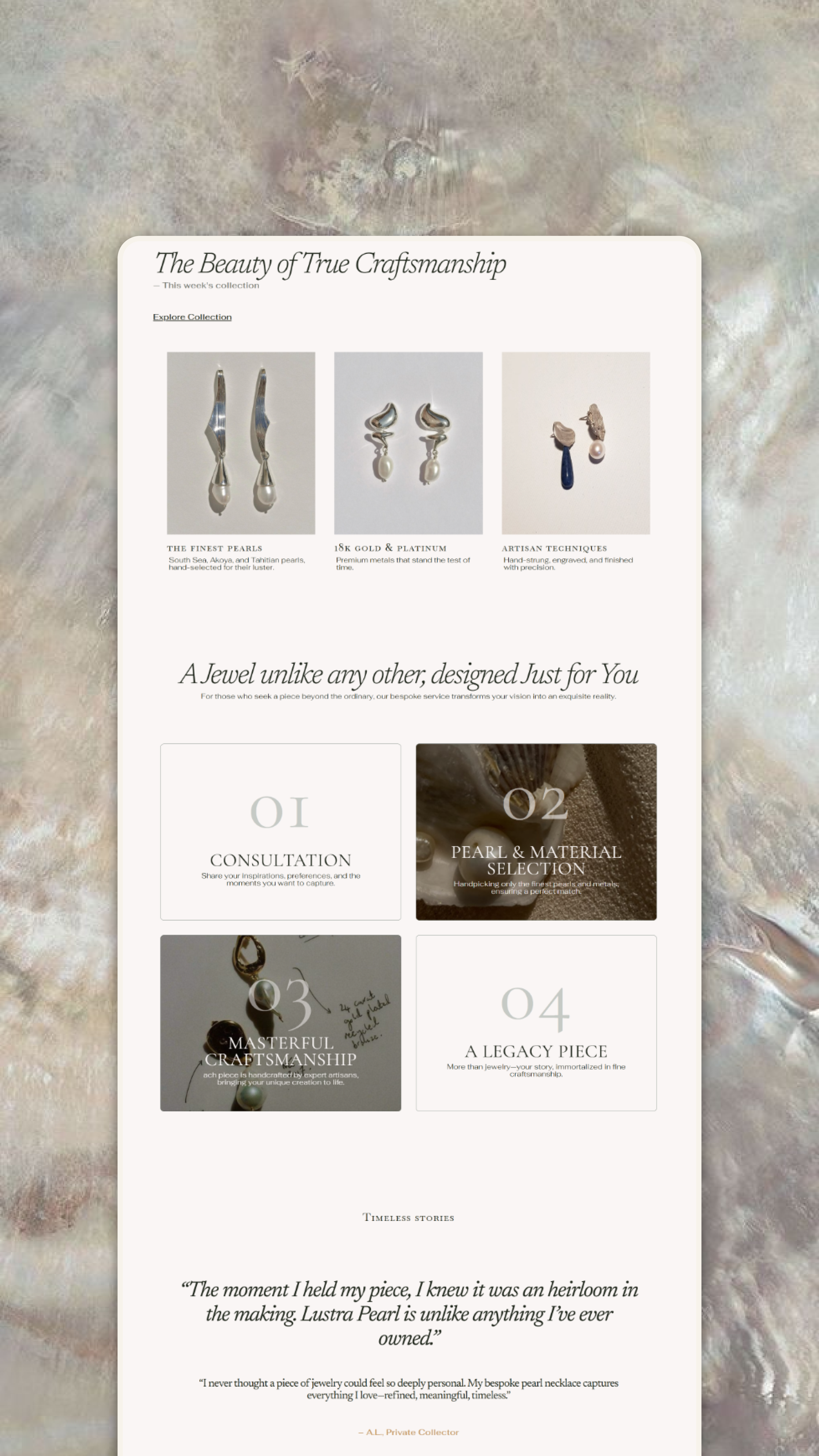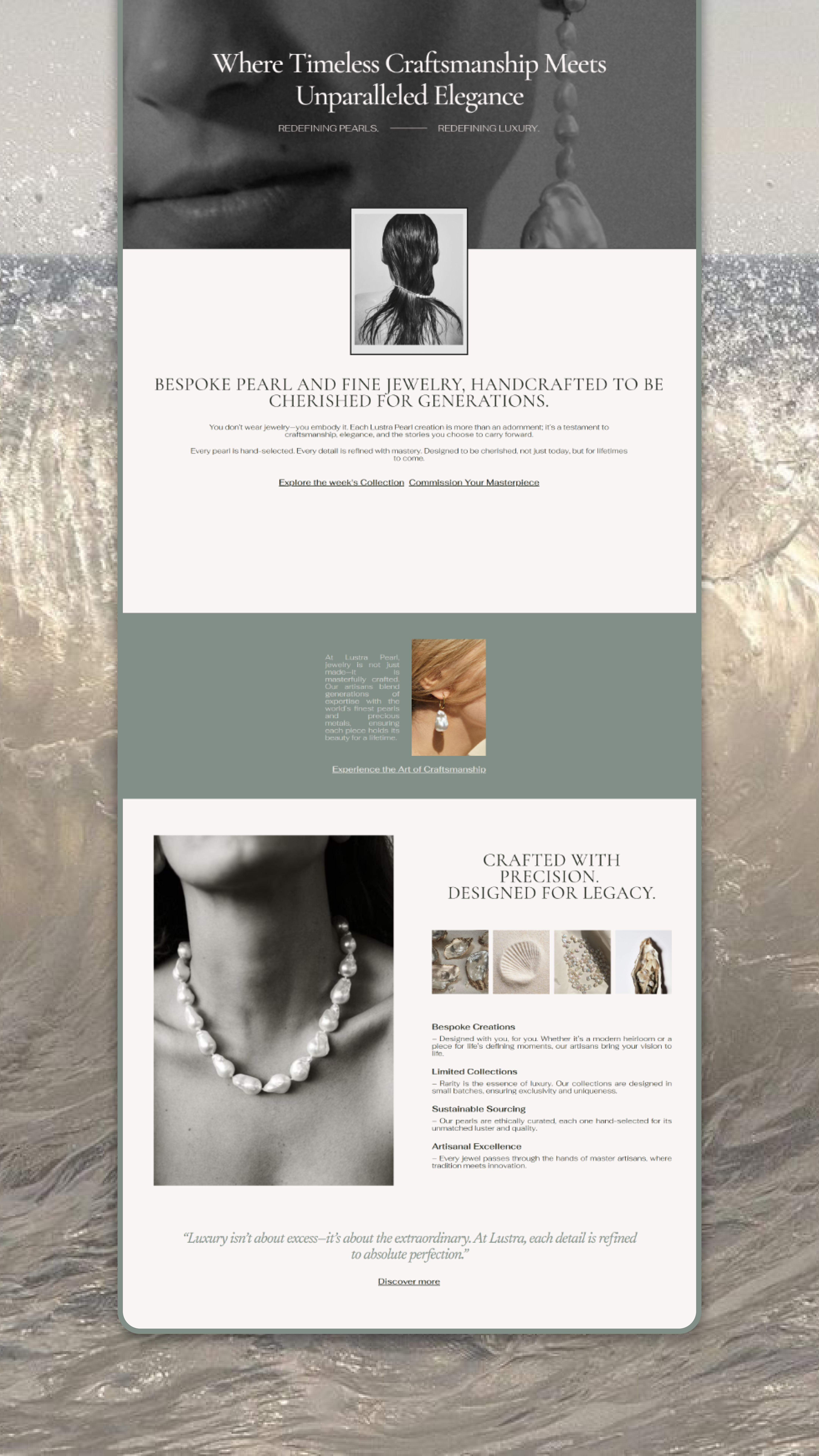 For Lustra Pearl, I designed a refined, editorial-style website to reflect the brand’s commitment to heritage craftsmanship and timeless artistry. The layout blends quiet luxury with modern UX, leading visitors through an intentional brand story, from bespoke process, to collection curation, to client inquiries.