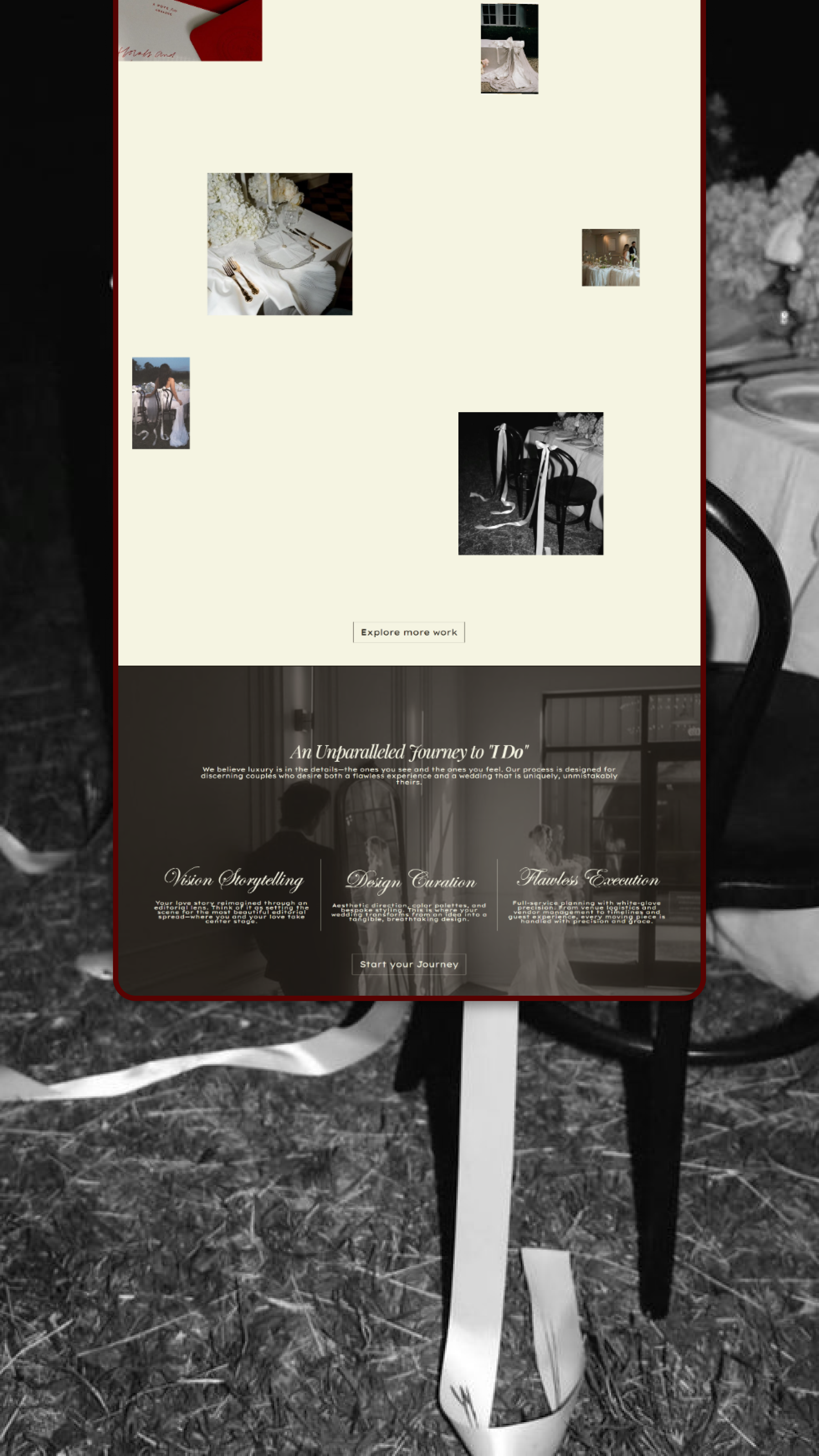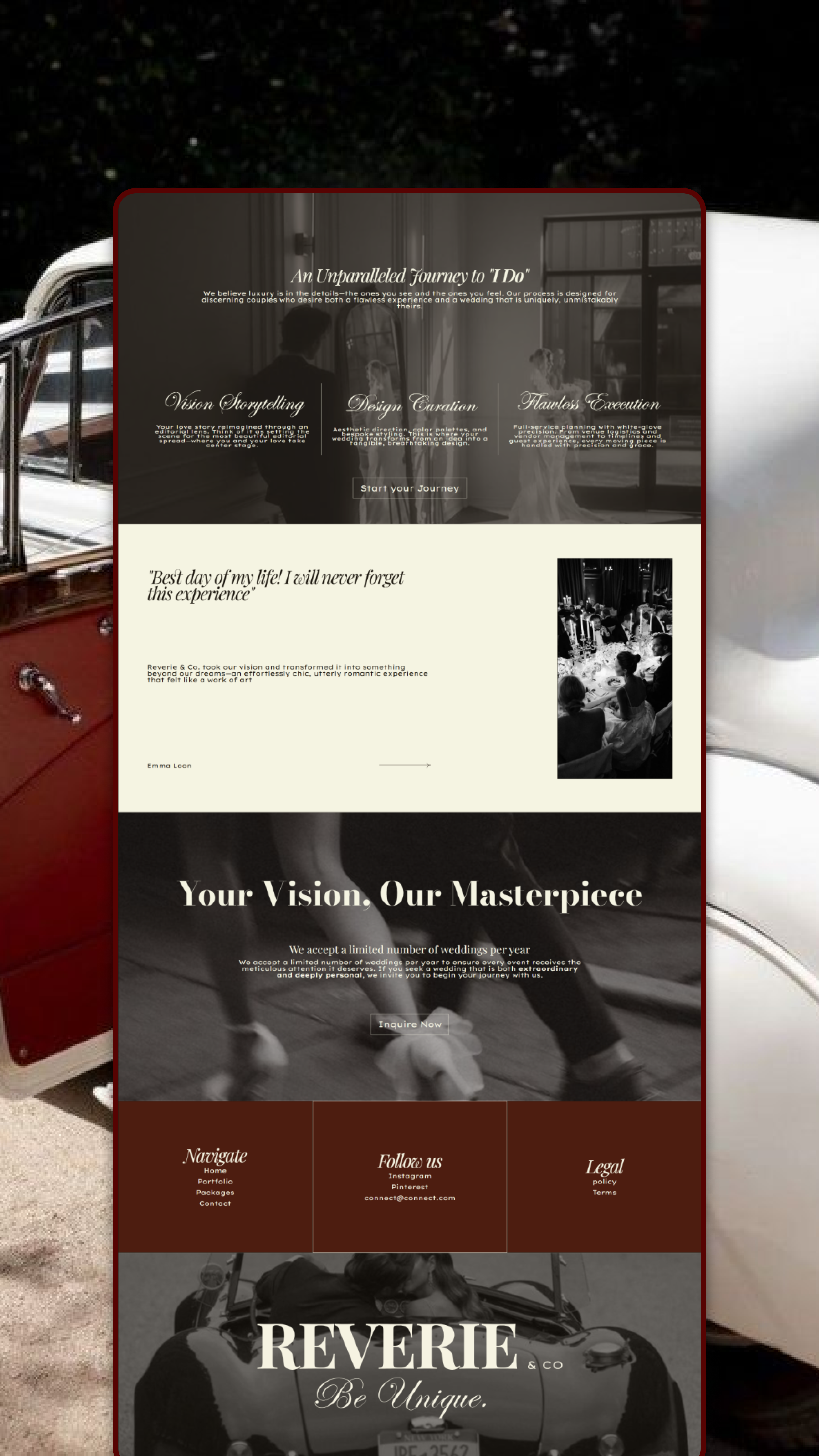 For Reverie & Co., I crafted a cinematic, immersive website experience that blends high-end design with strategic user flow. The site is visually striking yet intuitive, guiding visitors seamlessly through the brand’s philosophy, offerings, and process. Every element was carefully curated—from the elevated ‘Vibes’ section to the simple, elegant inquiry form—to communicate the brand’s exclusive nature, positioning Reverie & Co. as the top choice for visionary couples seeking a unique, impactful wedding experience.