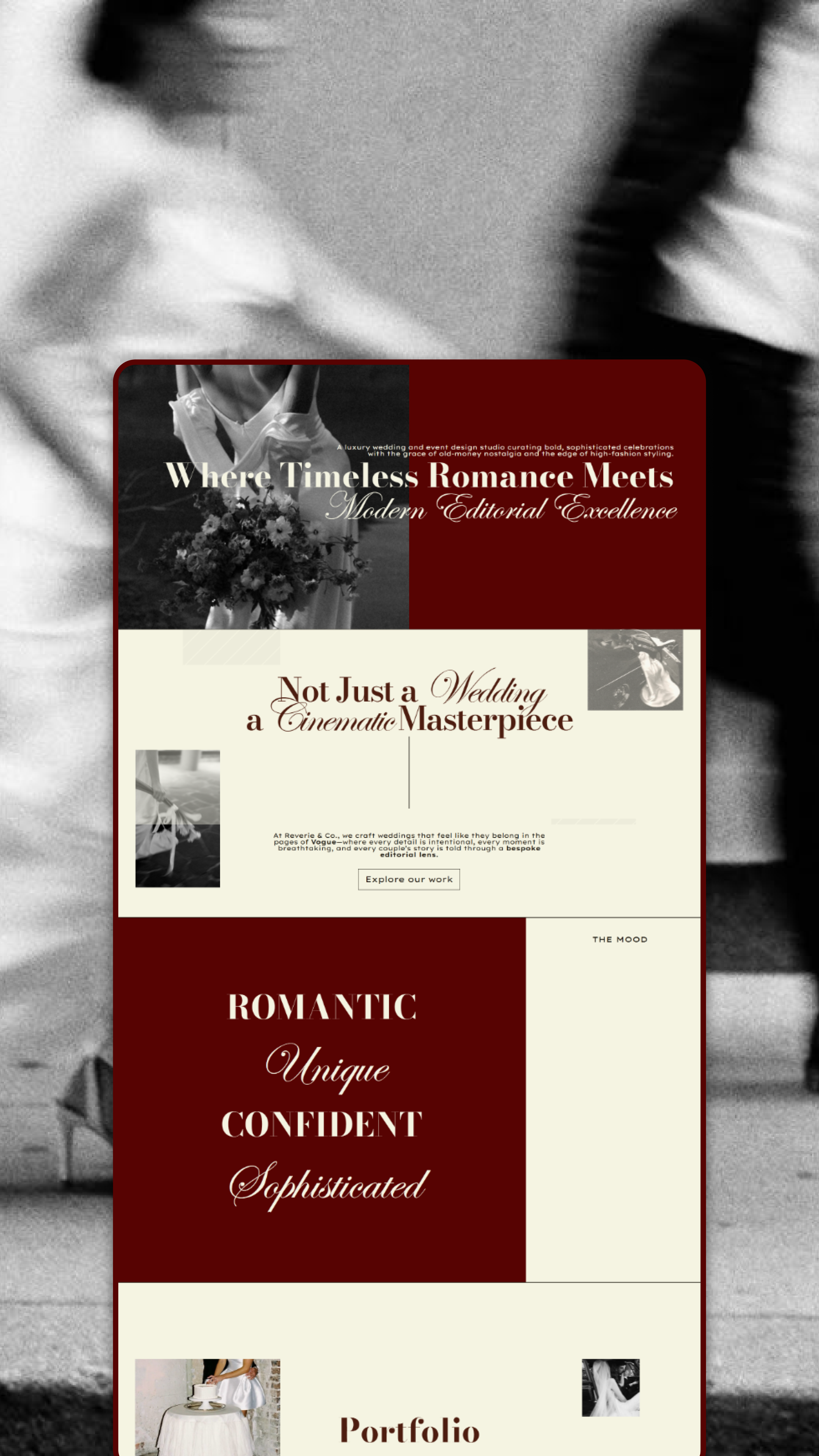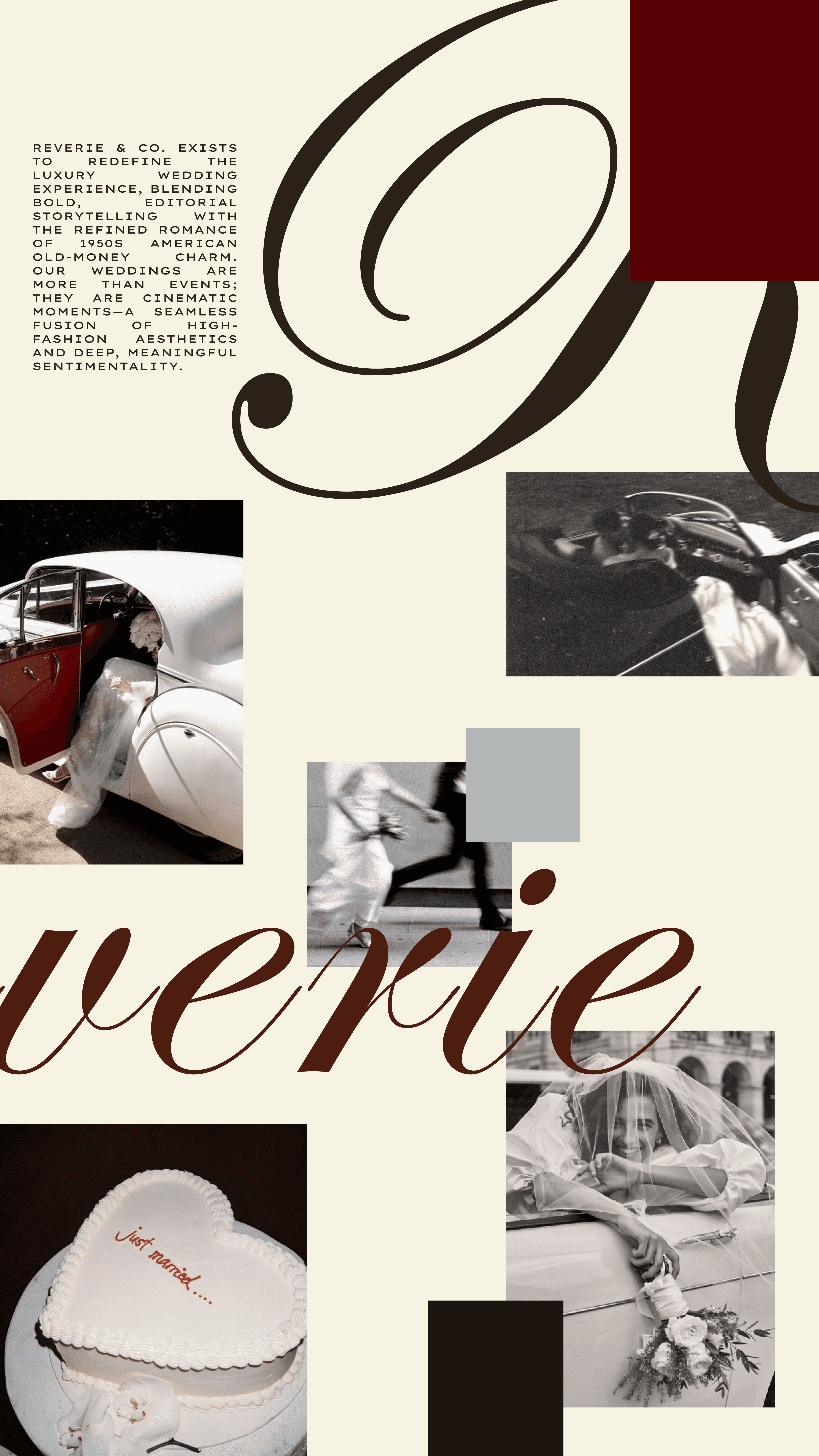 Reverie & Co. is a modern wedding planning studio that blends editorial sophistication with timeless romance. Through a bold yet refined design approach, the brand reflects a seamless fusion of high-fashion aesthetics and sentimental storytelling. The website design elevates this vision, seamlessly guiding high-end clients through a sophisticated and visually engaging journey