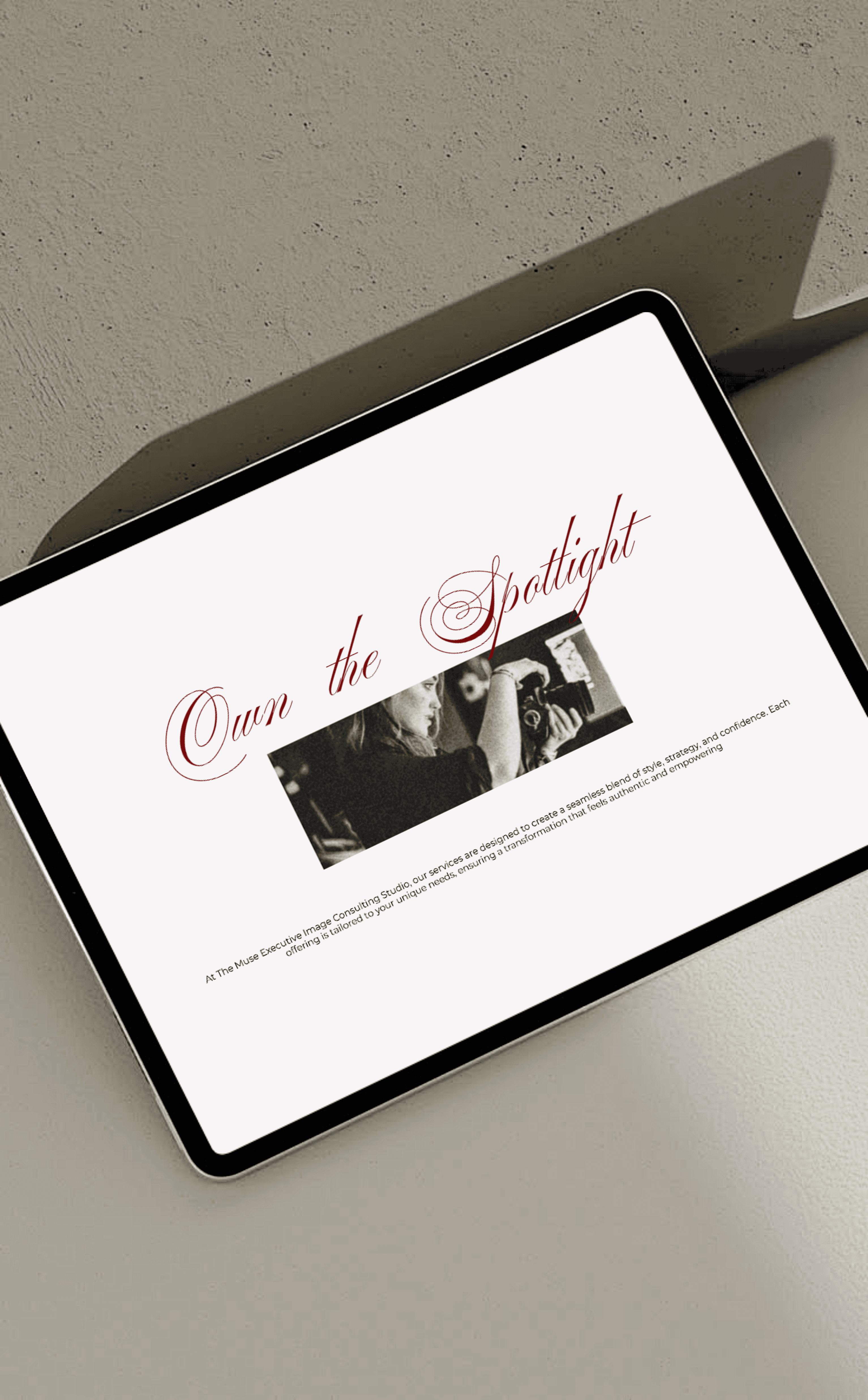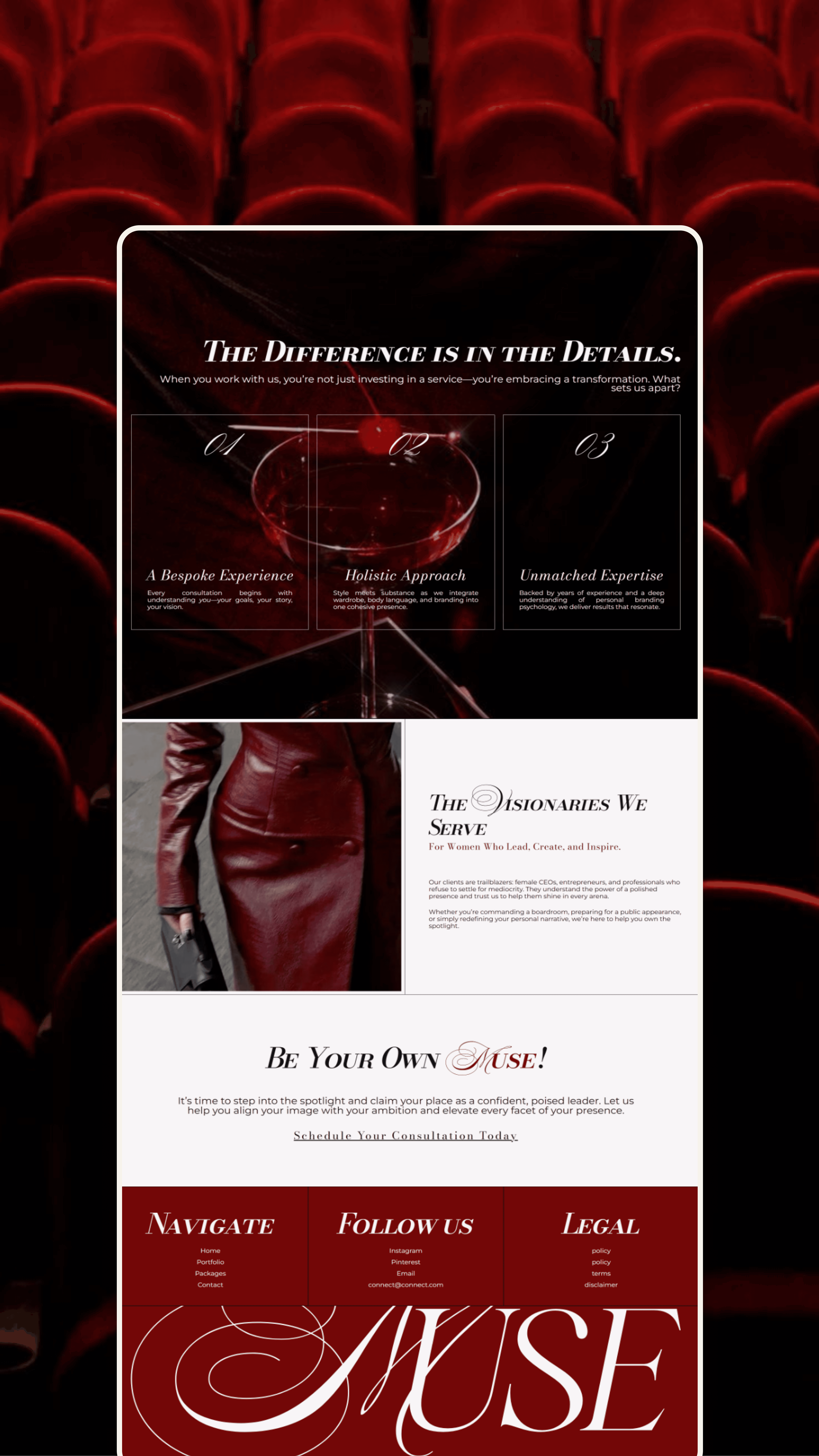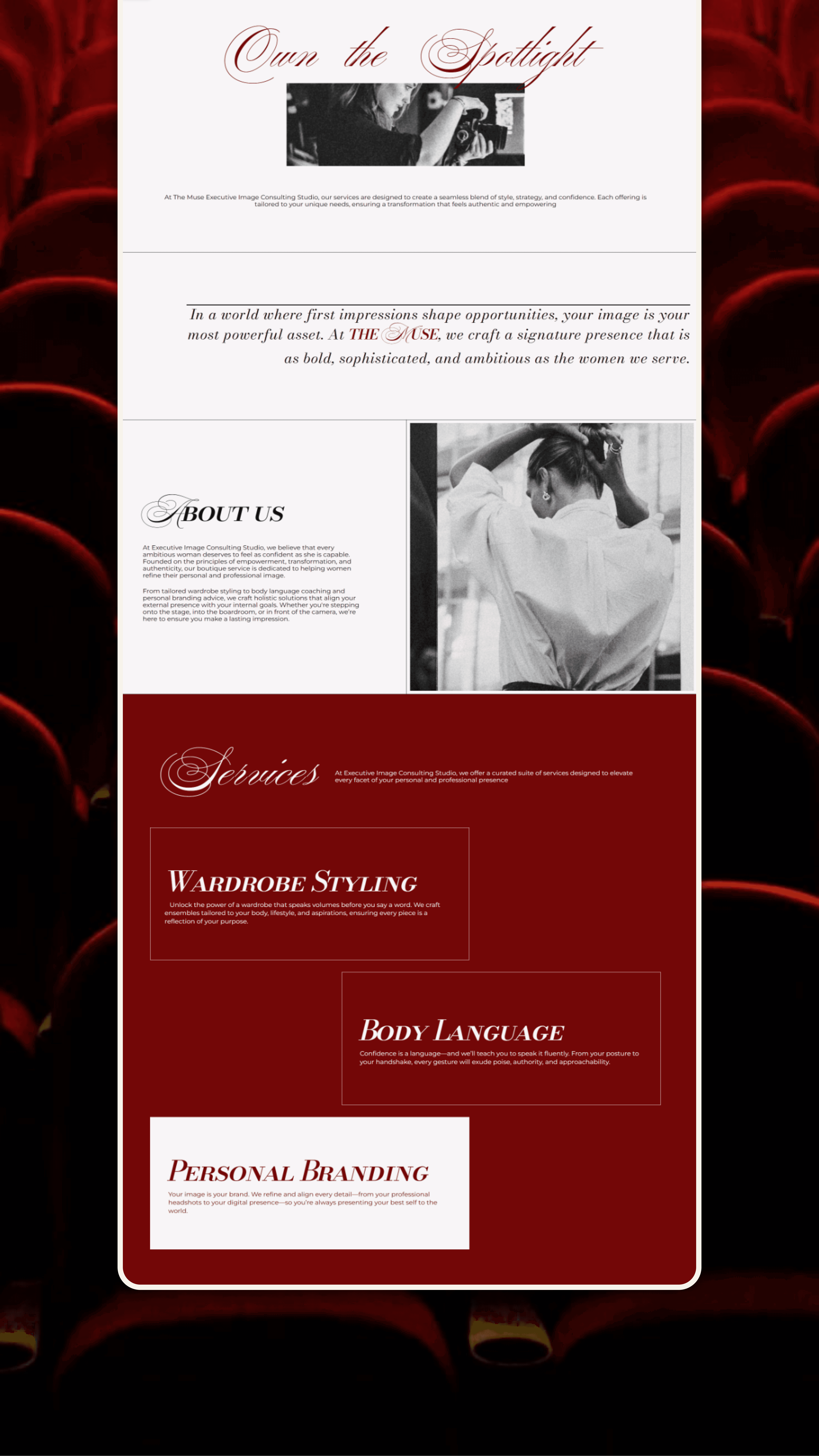 The Muse is a bold, identity-driven digital project for an executive image consulting studio focused on empowerment, elegance, and expression. The design blends high-contrast visuals with a confident editorial layout, capturing the essence of modern personal branding for high-achieving women.